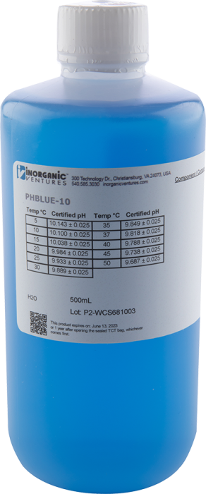 El buffer azul pH 10 de 500 mL de Inorganic Ventures es una solución estándar utilizada para calibrar y ajustar pHmetros y equipos de medición de pH en laboratorios. Esta solución está preparada con precisión para proporcionar un pH de 10, asegurando resultados confiables y consistentes en las mediciones de pH. Es ideal para aplicaciones donde se requiere una referencia estable y precisa para la calibración de instrumentos analíticos, facilitando así el trabajo en análisis químicos, biológicos y ambientales.